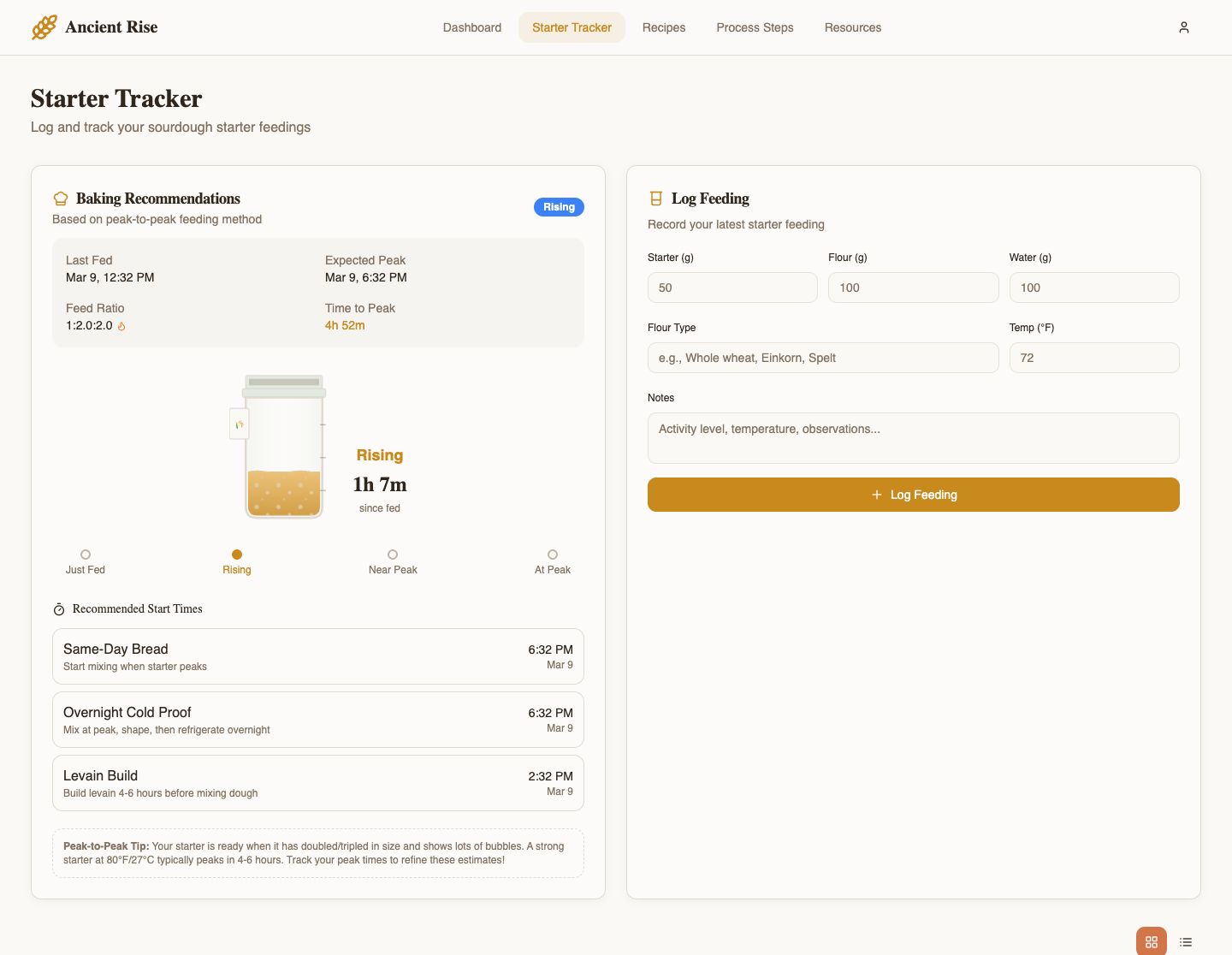 Ancient Rise helps home bakers track, manage, and master the sourdough process from starter to bake.